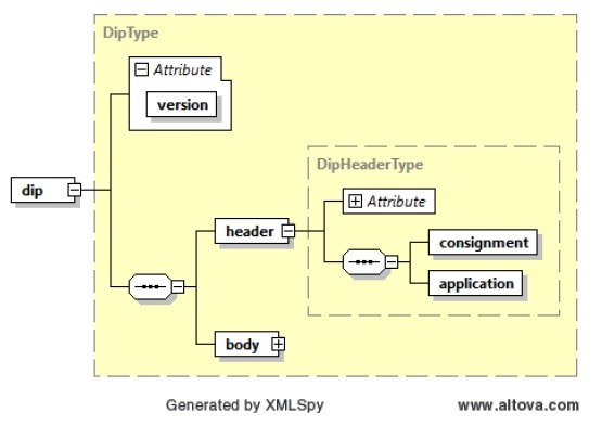 Das Wurzelelement der gesamten zu übertragenden XML-Datei ist dip:dip. Dieses umschließt den dip:header-Abschnitt, der alle Informationen des Senders für die Fachverfahrens- und Sender-Zuordnung enthält.