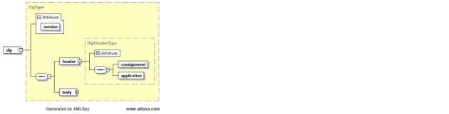 Das Wurzelelement der gesamten zu übertragenden XML-Datei ist nun dip:dip. Dieses umschließt den dip:header-Abschnitt, der alle Informationen des Senders für die Fachverfahrens- und Sender-Zuordnung enthält.