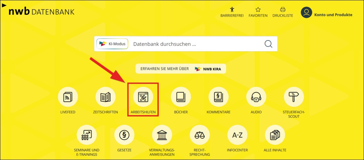 Klicken Sie auf der Startseite der NWB Datenbank auf „Arbeitshilfen“. Dort werden Ihnen alle in Ihrem Themenpaket NWB Rechnungswesen enthaltenen Arbeitshilfen angezeigt.